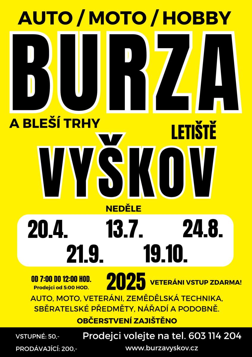 Pořádáme tradiční auto, moto, hobby burzy a bleší trhy. K vidění a zakoupení je vše, co se týká motorismu - auto, moto, díly, součástky, veteráni, sběratelské předměty nebo třeba literatura. Obnovujeme dlouholetou tradici burz, které se v minulosti konávaly na letišti Vyškov. veterÁni vstup zdarma!