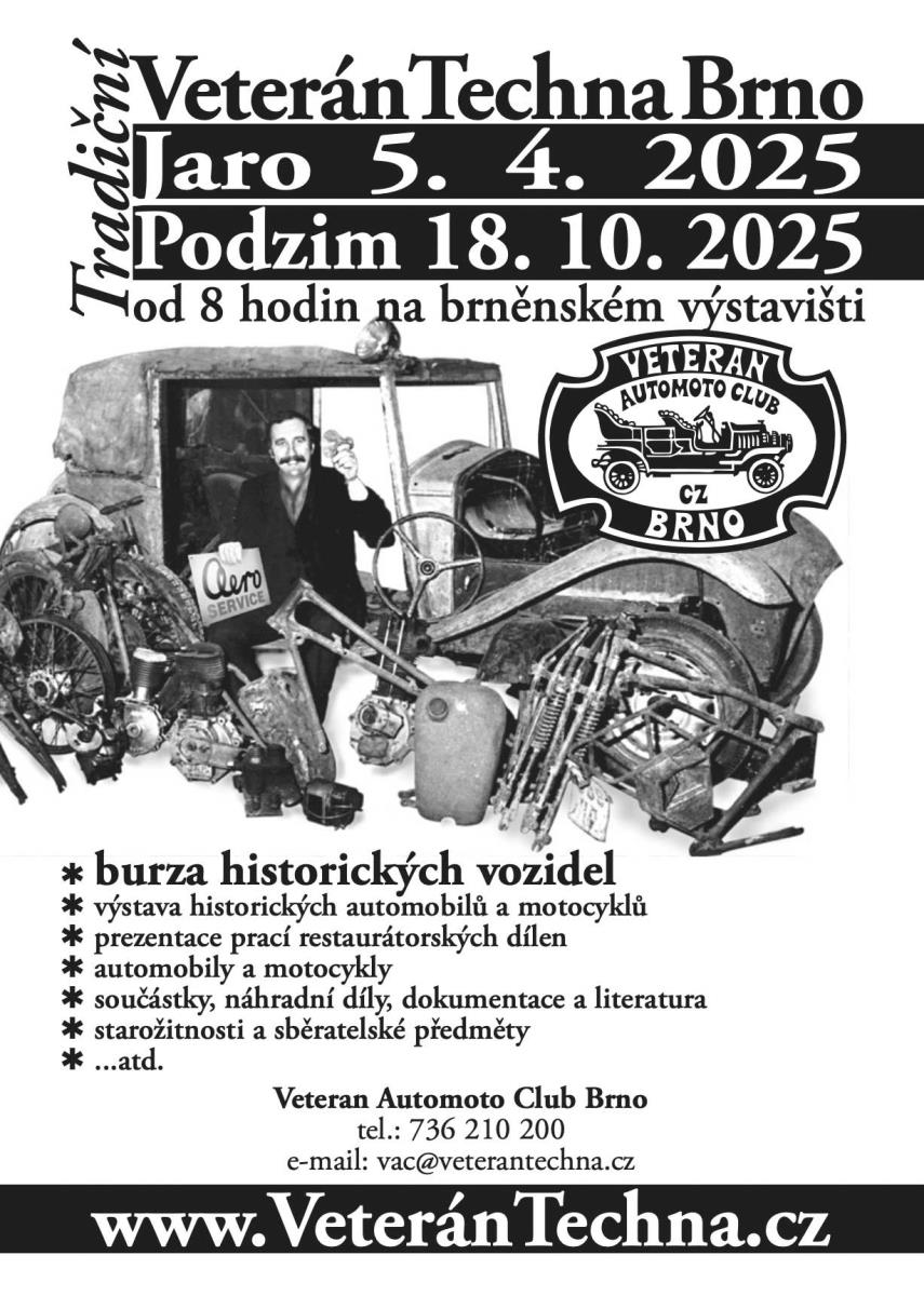 Burza a výstava historických vozidel - prezentace prací restaurátorských dílen ... automobily a motocykly - součástky, náhradní díly, dokumentace a literatura, starožitnosti, militárie a sběratelské předměty. Areál BVV od 8 hodin.