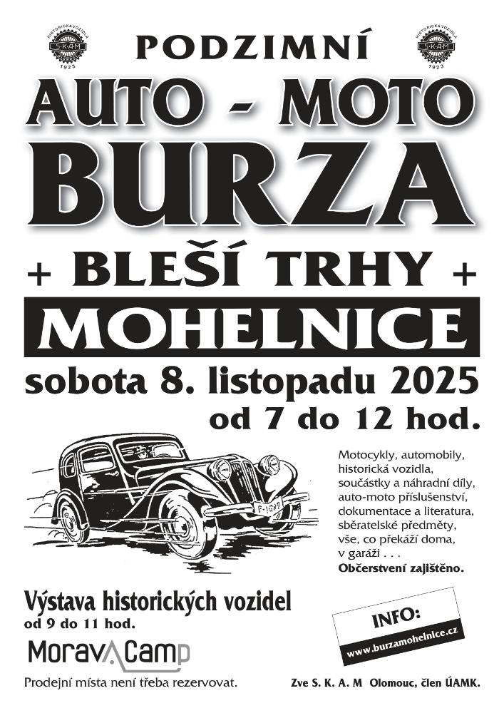 V sobotu 8. listopadu 2025 7-12h Vás zveme do Autocampu MoravaCamp Mohelnice na tradiční auto-moto burzu.