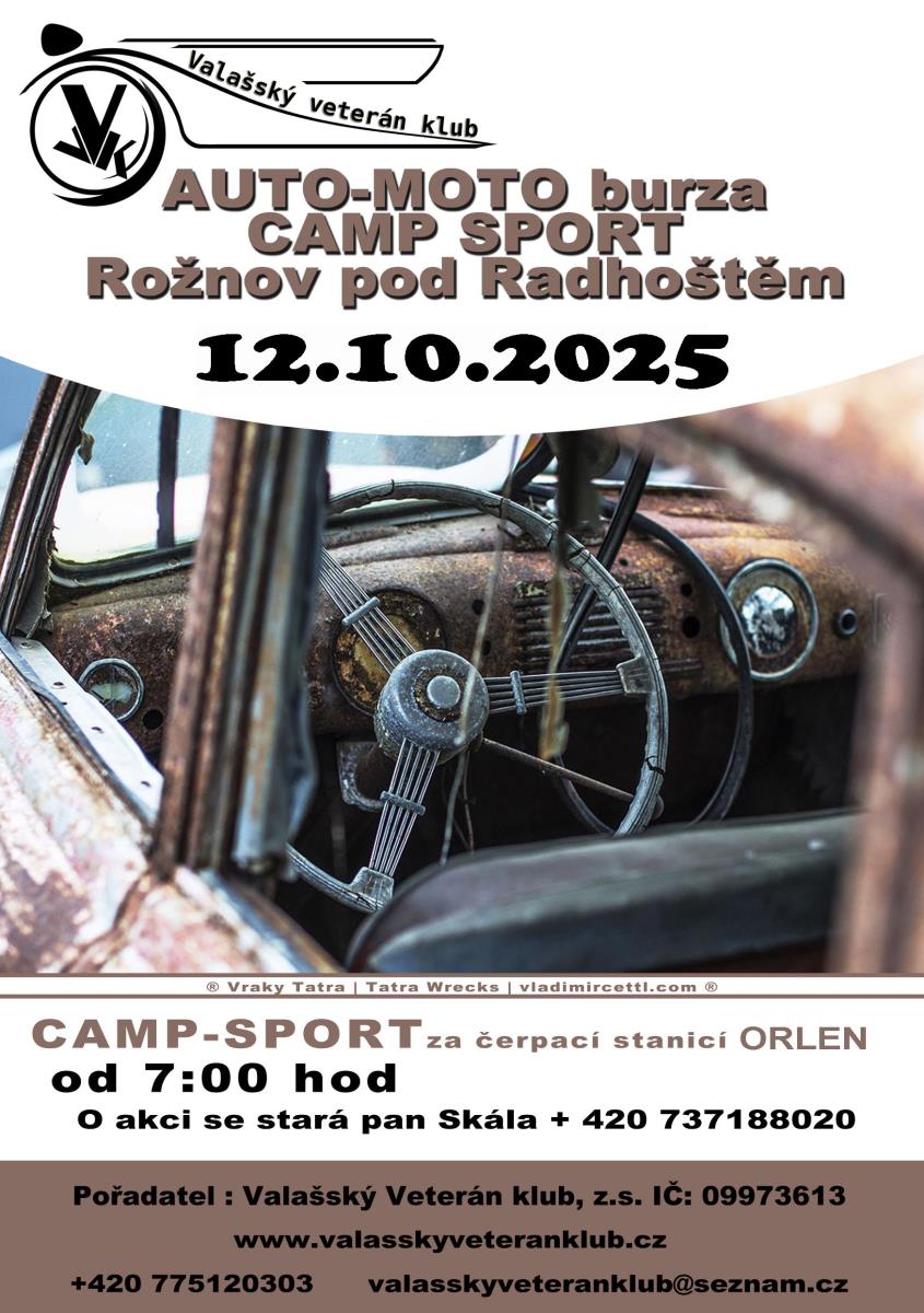 Zveme Vás na tradiční Auto-moto burzu do Rožnova pod Radhoštěm. V areálu Camp Sport za čerpací stanicí Orlen od 7:00. Akci má na starost pan Skála. Tel: 737188020