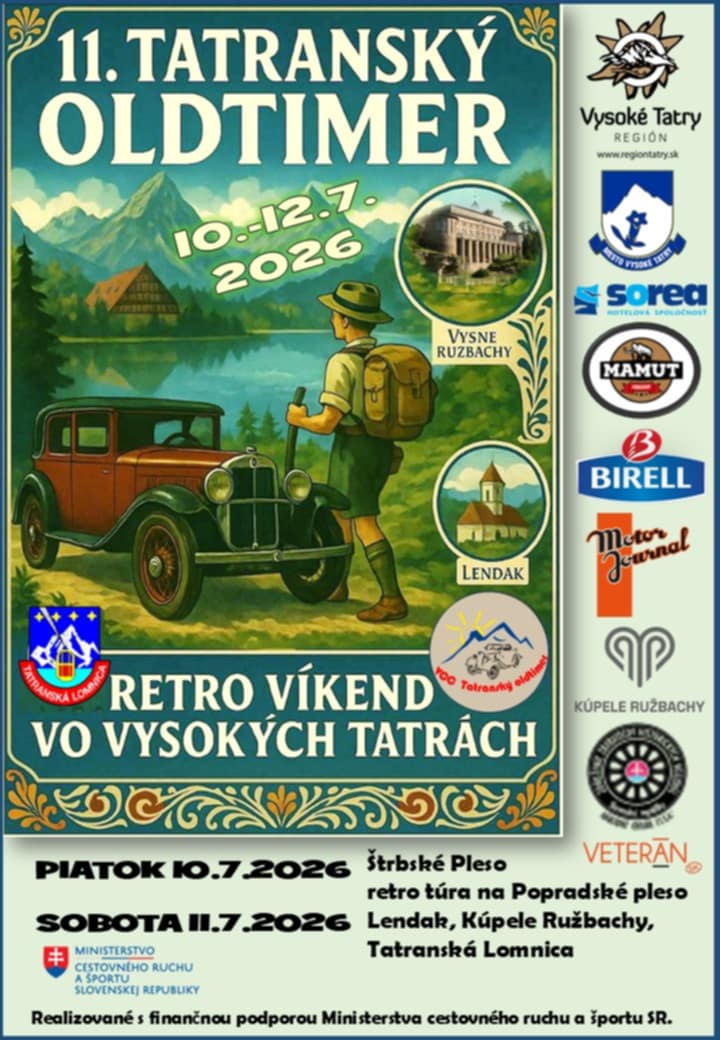 Novú dekádu veterán zrazu Tatranský Oldtimer v Tatranskej Lomnici začíname naozaj veľkolepo... Veterán zraz je určený pre vozidlá a motocykle vyrobené do roku 1945. - Piatková retro jazda na Štrbské Pleso a retro výlet v dobových kostýmoch na Popradské pleso - Sobota: - nenáročná 110 km jazda do Lendaku kde nás čakajú lendacké raňajky a folklór, pokačujeme do historických Kúpeľov Vyšné Ružbachy, koncert swingového kvarteta Elegance, módna prehliadka Salónu první republiky, kúpanie v dobových plavkách a penová Show. - Concours d' elegance - Tatranský volant - Miss Tatranský Oldtimer 2026 - staré dobré evergreeny v podaní Sweet little chicks - výstava obrazov svetoznámeho maliara Juriho Ševčuka |