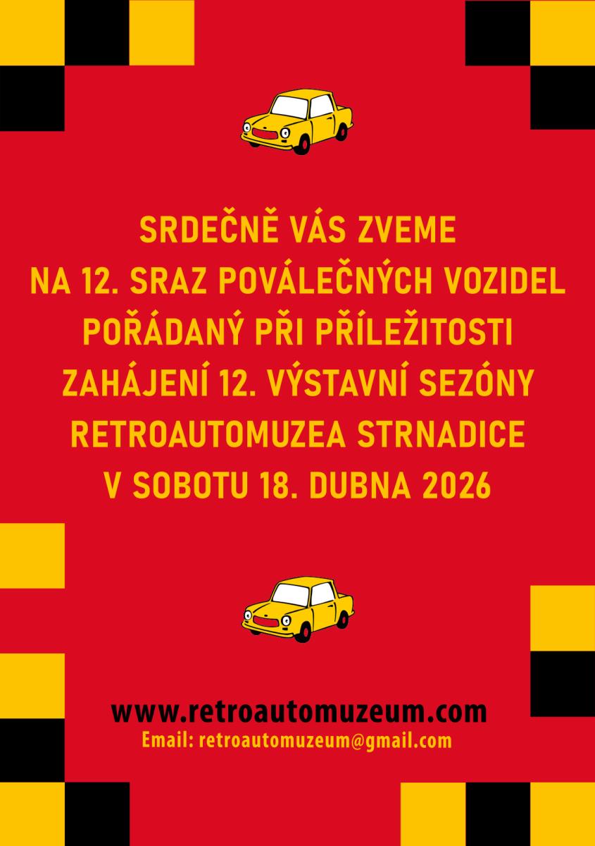 SRDEČNĚ VÁS zveme NA 12. sraz povÁLEČNÝch vozidel POŘÁDANÝ PŘI PŘÍLEŽitosti zahÁJENÍ 12. VÝstavnÍ SEZÓny retroautomuzea strnadice V sobotu 18. dubna 2026