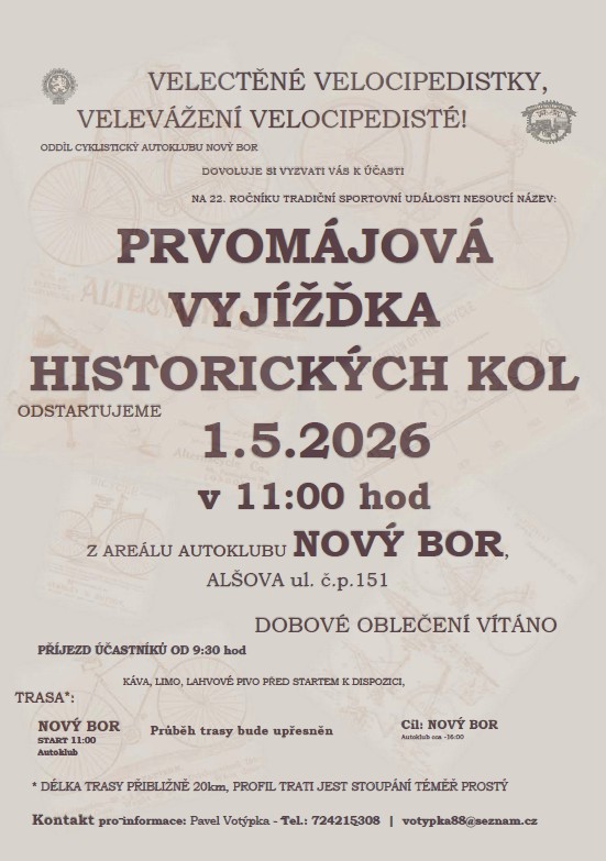 Zveme Vás na tradiční setkání příznivců historických kol v Novém Boru. Letos již 22. ročník. Odjezd na trasu v 11:00 z areálu Autoklubu Nový Bor Letos předpokládáme kratší trasu. Po obědě plánujeme zastávku ve sklárně. Pro podrobnosti sledujte událost na Facebooku. Těšíme se na Vás. |