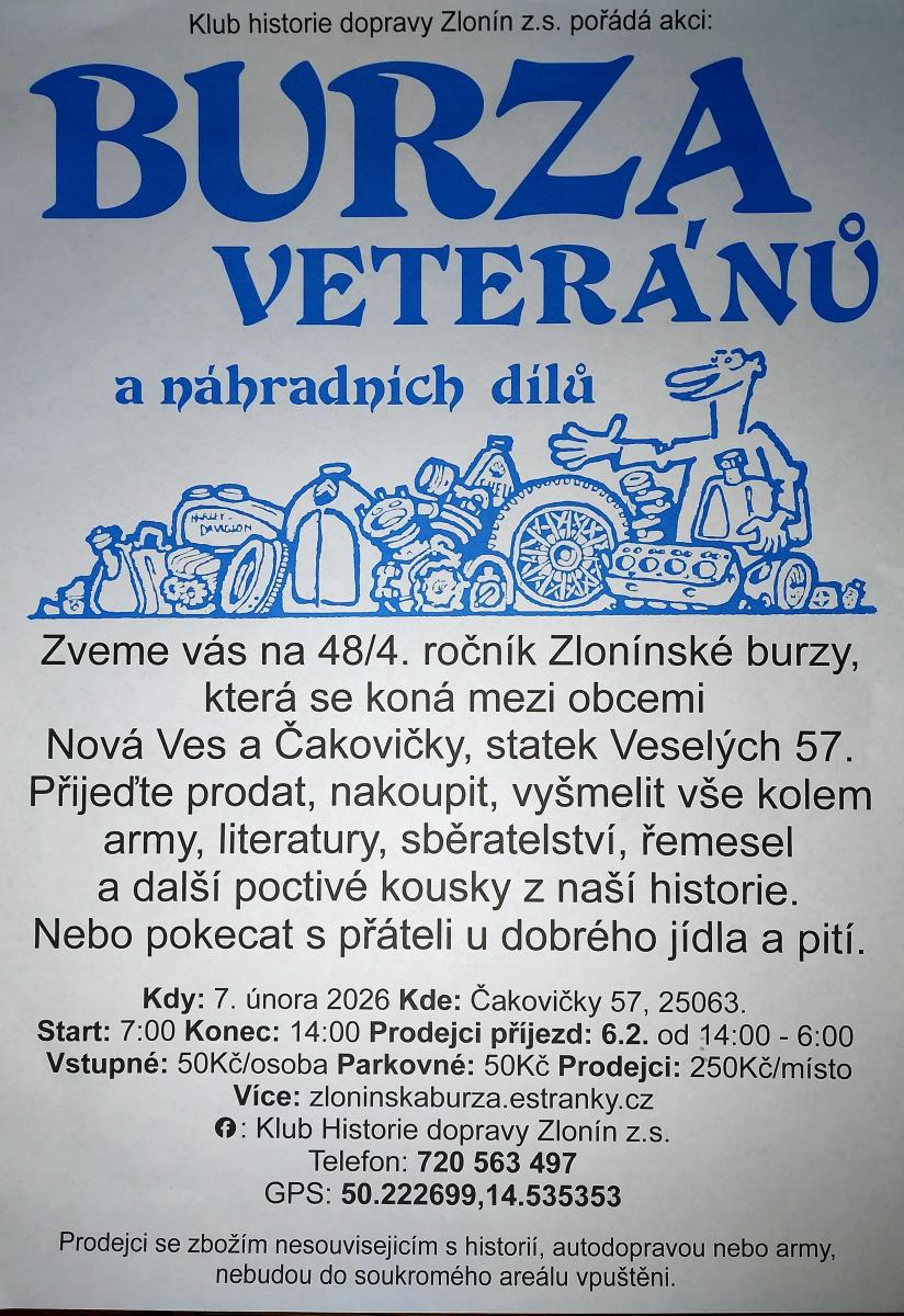Zveme vás na tradiční burzu veteránů,náhradních dílů,starožitností,army, nářadí,literatury a bude na vás čekat bohaté občerstvení. Tak doražte do obce Čakovičky 57 na statek Veselých.