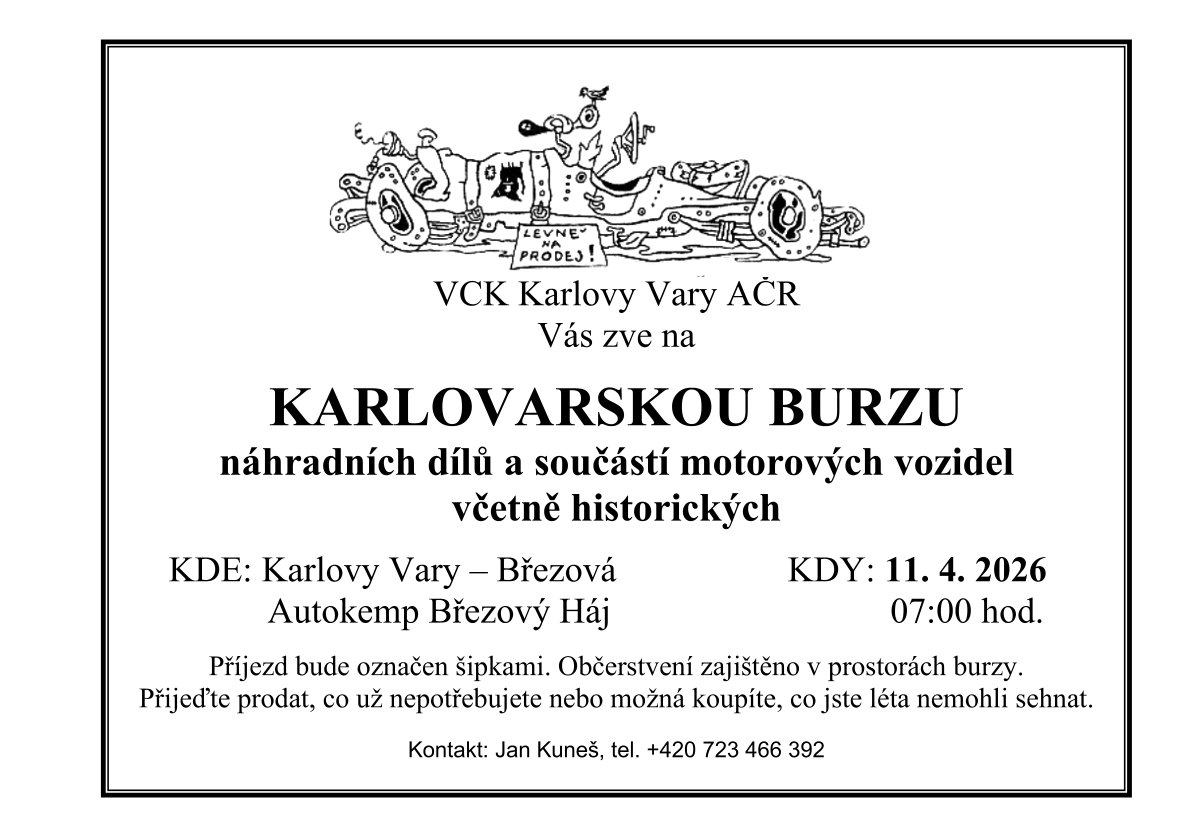 Karlovarská burza náhradních dílů a součástí motorových vozidel se koná v sobotu 11. 4. v Autokempu Březový Háj, Staromlýnská 154/35. Začátek je od 07:00 hodin. Příjezd bude označen šipkami. Občerstvení zajištěno v prostorách burzy. Přijeďte prodat, co už nepotřebujete nebo možná koupíte, co jste léta nemohli sehnat. Kontakt: Jan Kuneš, tel. +420 723 466 392