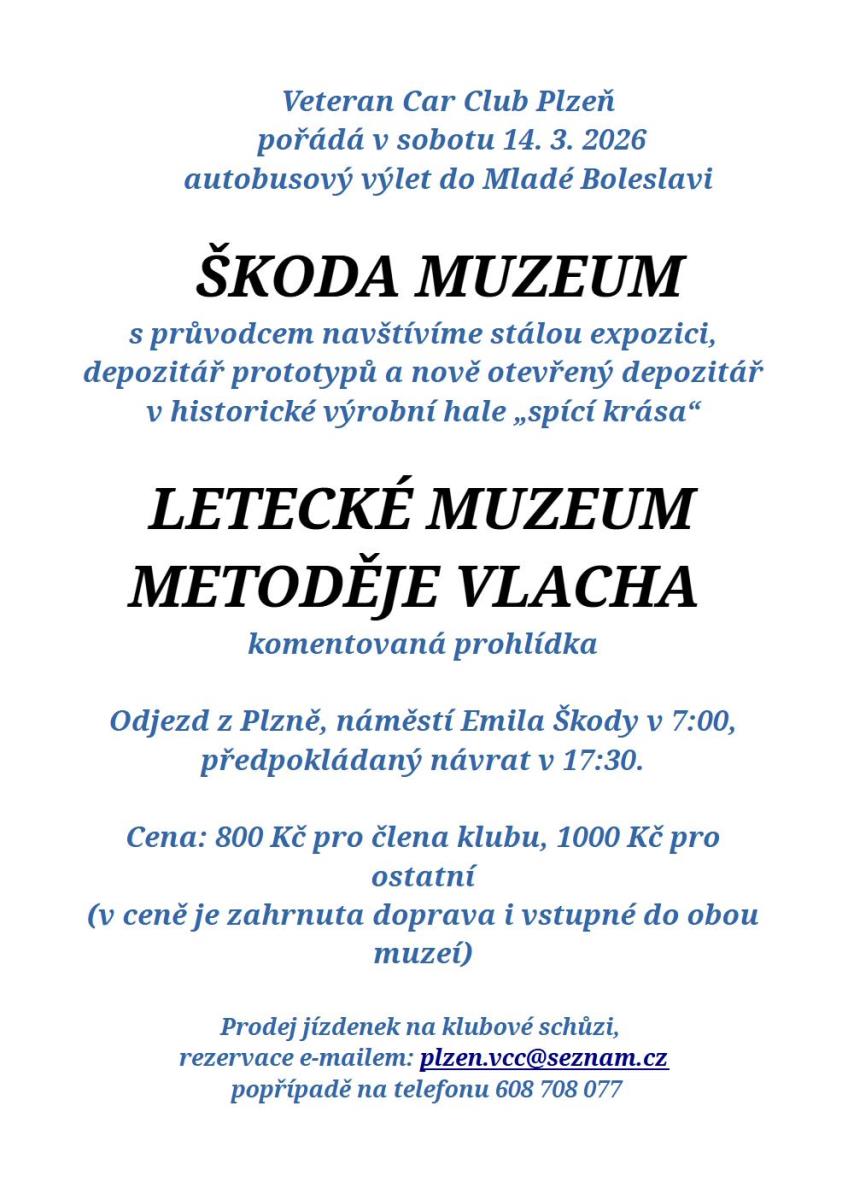 Škoda muzeum a Letecké muzeum Metoděje Vlacha. Veteran car club Plzeň pořádá autobusový výlet do Mladé Boleslavi nejen pro členy klubu, ale i pro veřejnost. Ve Škoda muzeu navštívíme s průvodcem stálou expozici, depozitář prototypů a nově otevřený depozitář "spící krása". Prohlídka Leteckého muzea Metoděje Vlacha bude rovněž s komentářem. Odjezd z Plzně, náměstí Emila Škody v 7:00, návrat přibližně v 17:30. Cena za osobu je 800 Kč pro člena klubu, 1000 Kč pro veřejnost. V ceně je zahrnuta doprava i vstupné do obou muzeí. V obou muzeích je možnost občerstvení. Rezervace na e-mailu: plzen.vcc@seznam.cz, nebo na telefonu 608 708 077. Platba převodem na účet klubu, nebo hotově na schůzi klubu. |
