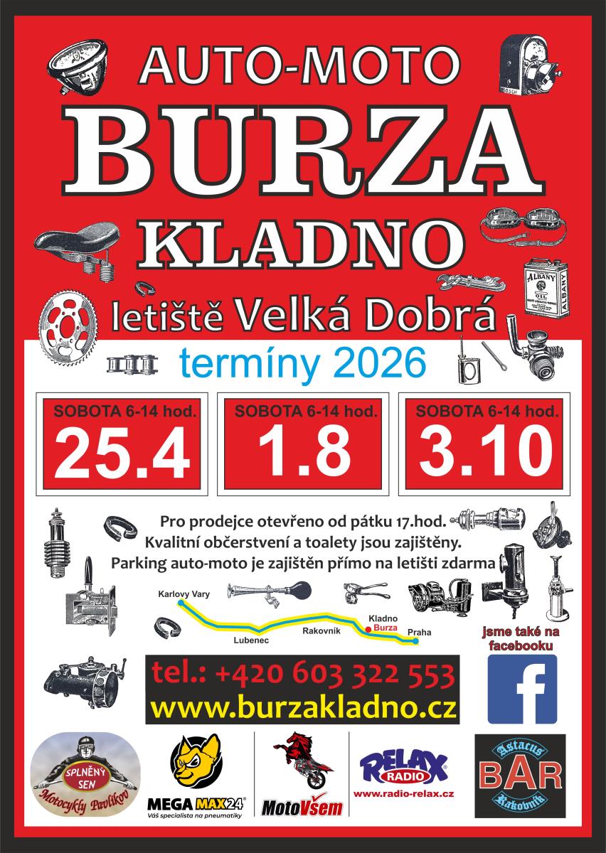 Přátelé, kamarádi...rádi vás uvidíme na naší tradiční velké jarní motoristické burze na záložním letišti Velká Dobrá u Kladna 25.dubna 2026. Přijeďte prodat nebo koupit věci na veterány, motorky a auta,popř. traktory a ostatní techniku.Je zde dostatek místa pro modeláře, starožitníky,military,vetešníky a ostatní sběratele.Těšíme se na setkání...parta pořadatelů Burzy Kladno. |