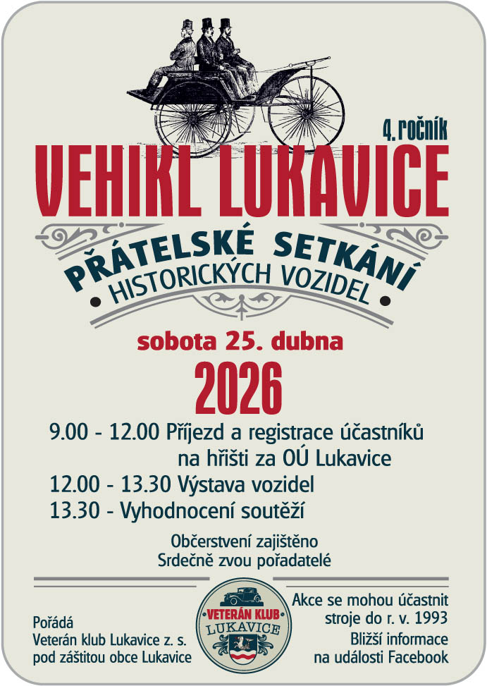 Program: 9:00 - 12:00 Příjezd a registrace účastníků na hřišti za OÚ Lukavice 12:00 - 13:30 Výstava vozidel 13:30 - Vyhodnocení soutěží