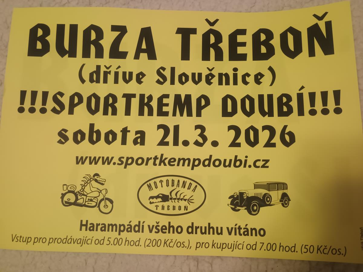 Srdečně Vás zveme na Burzu Třeboň Burza se koná v sobotu dne 21.3. 2026 v !!!Sportkempu Doubí!!! cca 2 km od Třeboně směr Nové Hrady. Přijďte koupit co ještě nemáte a prodat co již nepotřebujete. !!! Občerstvení zajištěno!!! Vstup pro prodávající od 5:00 hod pro kupující 7:00 hod. Zboží s neveteránskou tématikou je povoleno. Těšíme se na Vás. Motobanda Třeboň. Info na tel.605163117 |