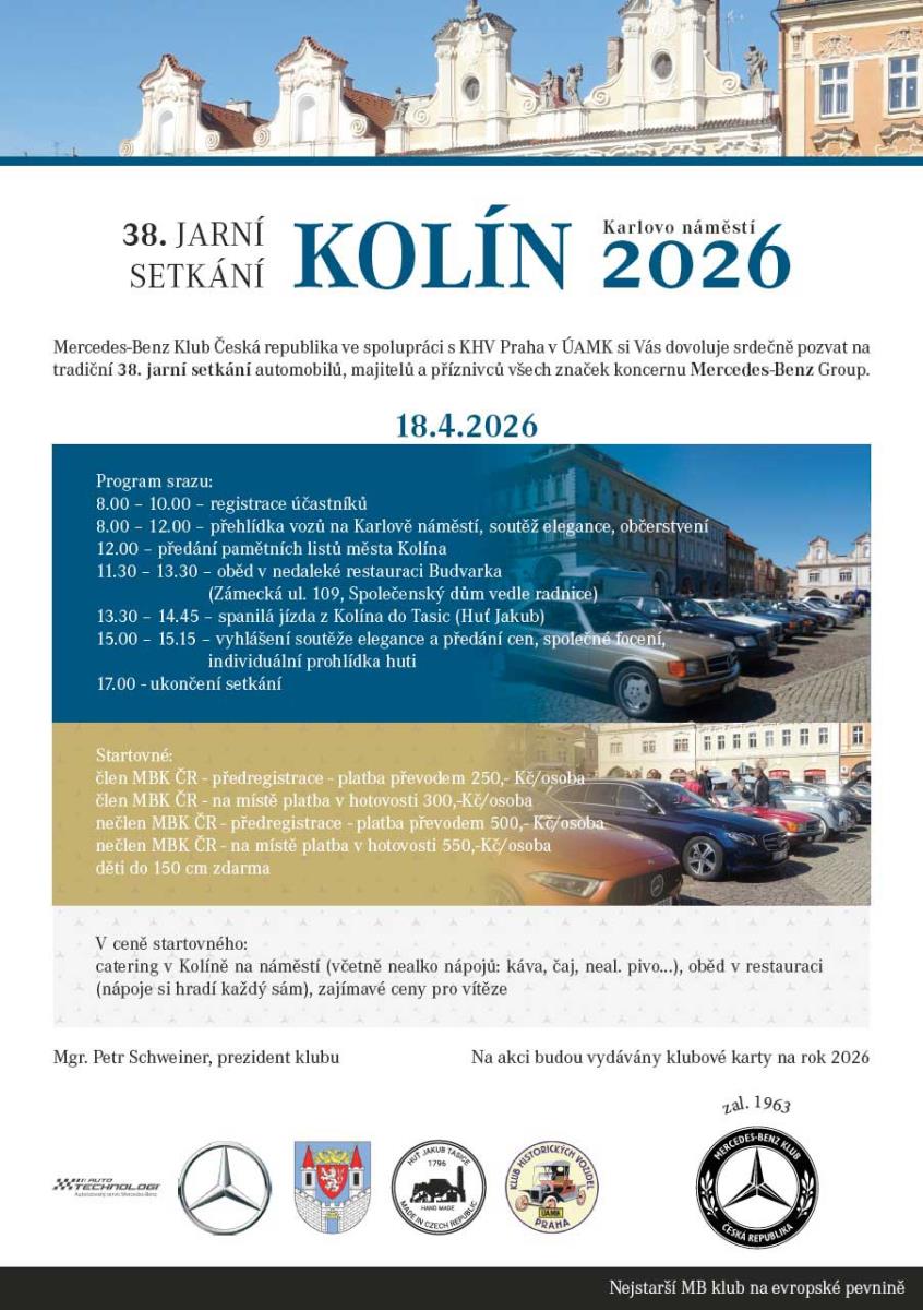 Vážení členové Mercedes-Benz klubu Česká republika a příznivci značky Mercedes-Benz, dovolujeme si Vás pozvat v sobotu 18. dubna 2026 do Kolína. Součástí setkání je tedy možnost nabídnout k prodeji svůj vůz nebo náhradní díly k našim miláčkům. Na Vaši nabídku můžeme též upozornit při komentovaných vstupech. Program srazu: 8.00 – 10.00 – registrace účastníků 8.00 – 12.00 – přehlídka vozů na Karlově náměstí, soutěž elegance, občerstvení 12.00 – předání pamětních listů města Kolína 11.30 – 13.30 – oběd v nedaleké restauraci Budvarka (Zámecká ul. 109, Společenský dům vedle radnice) 13.30 – 14.45 – spanilá jízda z Kolína do Tasic (Huť Jakub) 15.00 – 15.15 – vyhlášení soutěže elegance a předání cen, společné focení individuální prohlídka huti 17.00 - ukončení setkání |