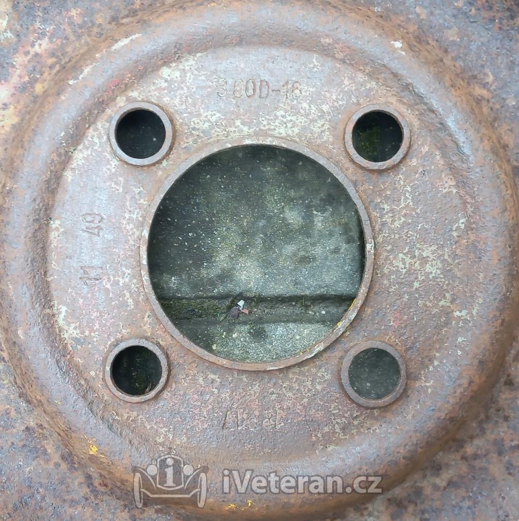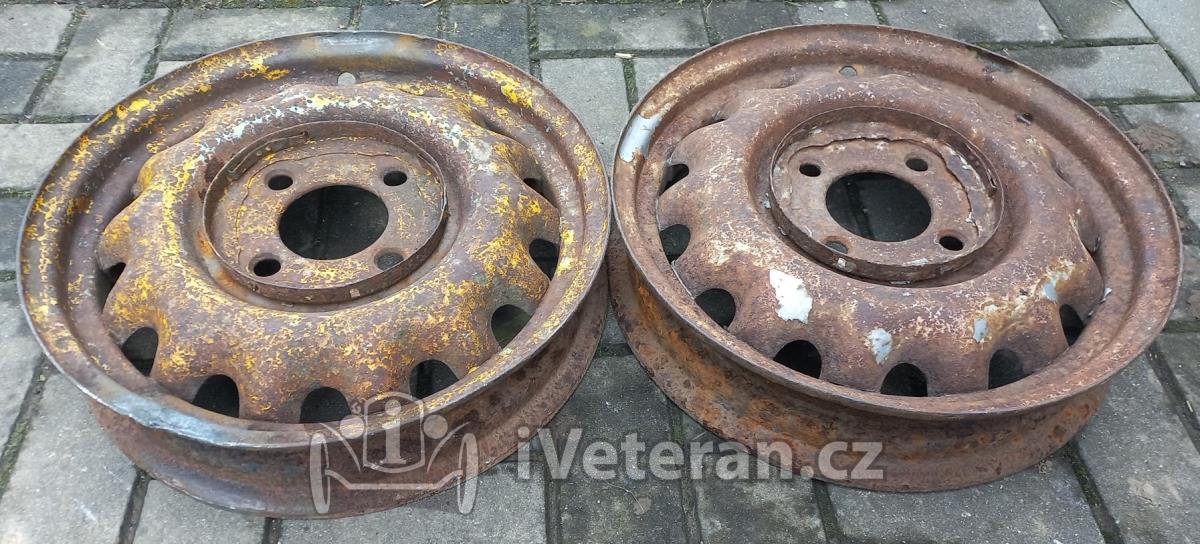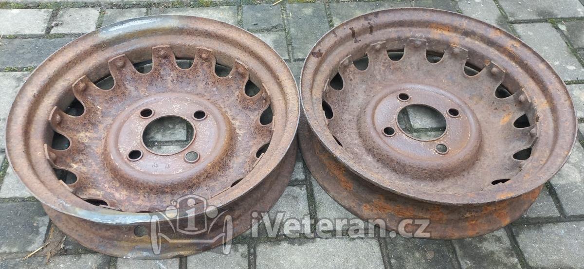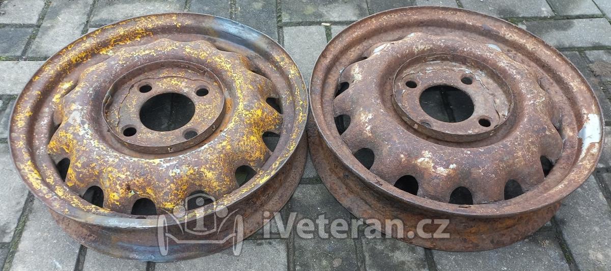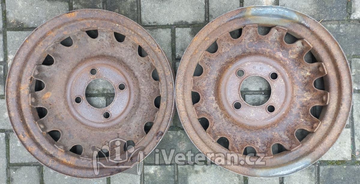 2 ks disky na Škoda 1101 a 1102 Tudor v nálezovém stavu, stav viz foto, koroze především v ráfku pod pneu, k renovaci na otryskání, jinak slušné a použitelné, rovné, jeden kus opravený okraj za tepla, výroba 1949, díry na šrouby OK nevymačkané, bez prasklin, značeny rokem výroby a logem Vítkovic, rozměr 3.00Dx16, průměr 44 cm, rozteč děr 4x130 mm, středový otvor 85 mm, šířka ca 10.3 cm, více foto zašlu rád na požádání, v případě dotazu mě neváhejte kontaktovat, osobní odběr na Vysočině nebo Přerov po dohodě, zaslání dle tarifu ČP nebo PPL možné, cena 500 Kč/ks rozumná
