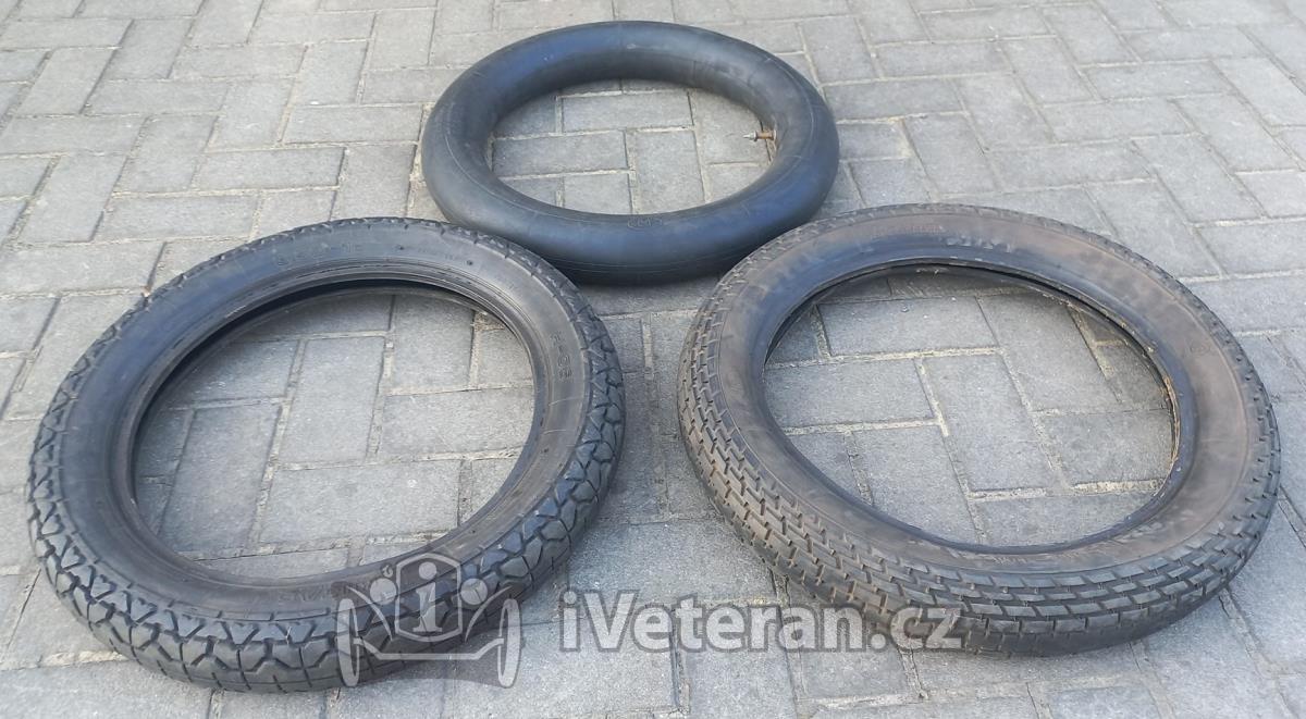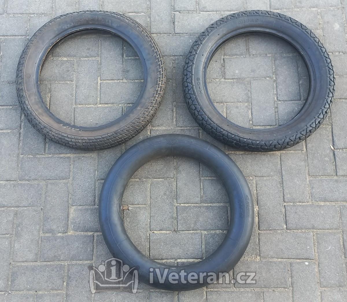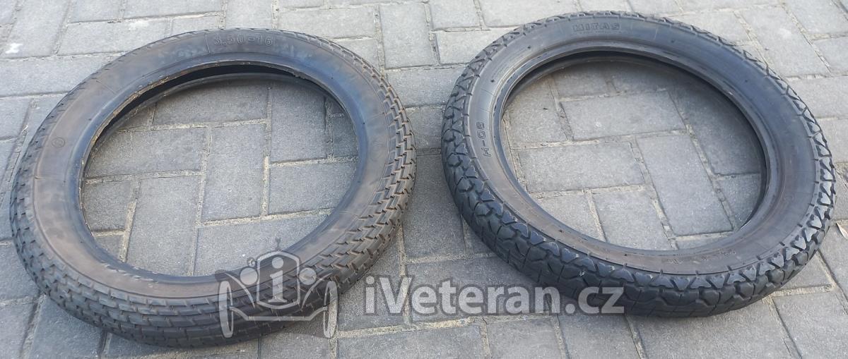 2 ks originál starší pneu Mitas + Barum rozměru 3.50x16 na větší kývačku Jawa 250/350 v nálezovém stavu, stav viz foto, pneu slušné, použitelné, vzorek a patky pneu ok, použitelné na moto, na vystavení na statické účely nebo na moto "do lesa", nějaký vozík atp. :-), ceny rozumné dohodou, mám k tomu ještě 1x duši 3.50x16 - moc pěkná, nestyřelá, drží tlak, bez fleku, odběr Žďár nad Sázavou nebo Přerov po dohodě předem, jinak zaslání dle tarifu ČP nebo PPL