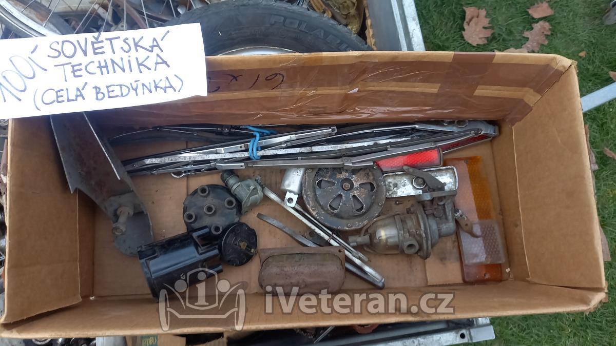 Směs dílů ze sovětské techniky(stěrače, houkačka, pumpa, víko rozdělovače, nářadí...), pouze co je na foto a všechno dohromady.