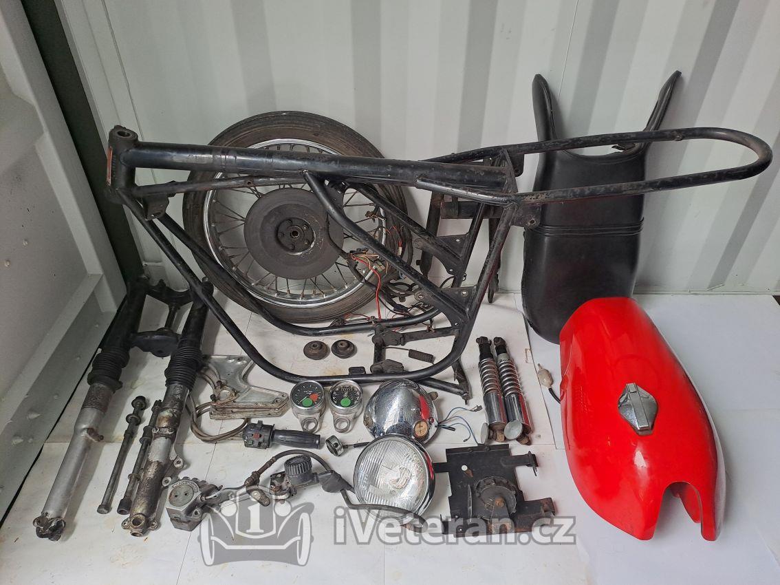 Rám-nebouraný se štítkem ,kyvka,vidlice,stojan,přední kolo ,třmen,pumpa,přepínače,držáky budíků,otáčkoměr,tacho-na díly,zadní tlumiče,laminátová nádrž,sedlo,přední světlo Lucas,klaxon,držák baterky,hliníkové držáky stupaček,osy kol,více foto mailem