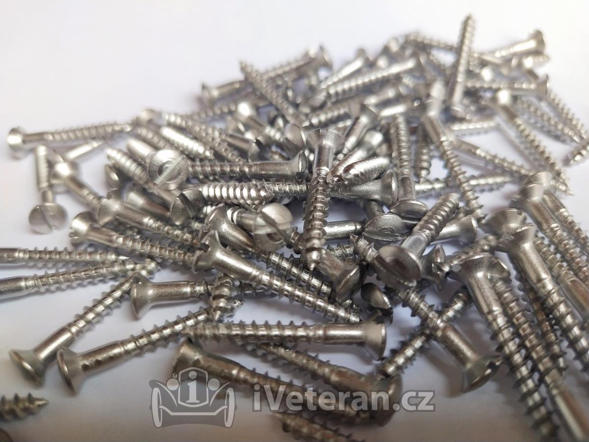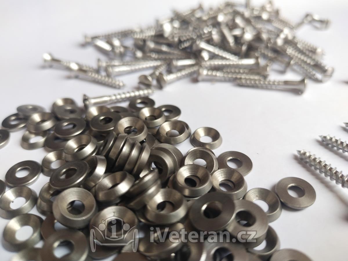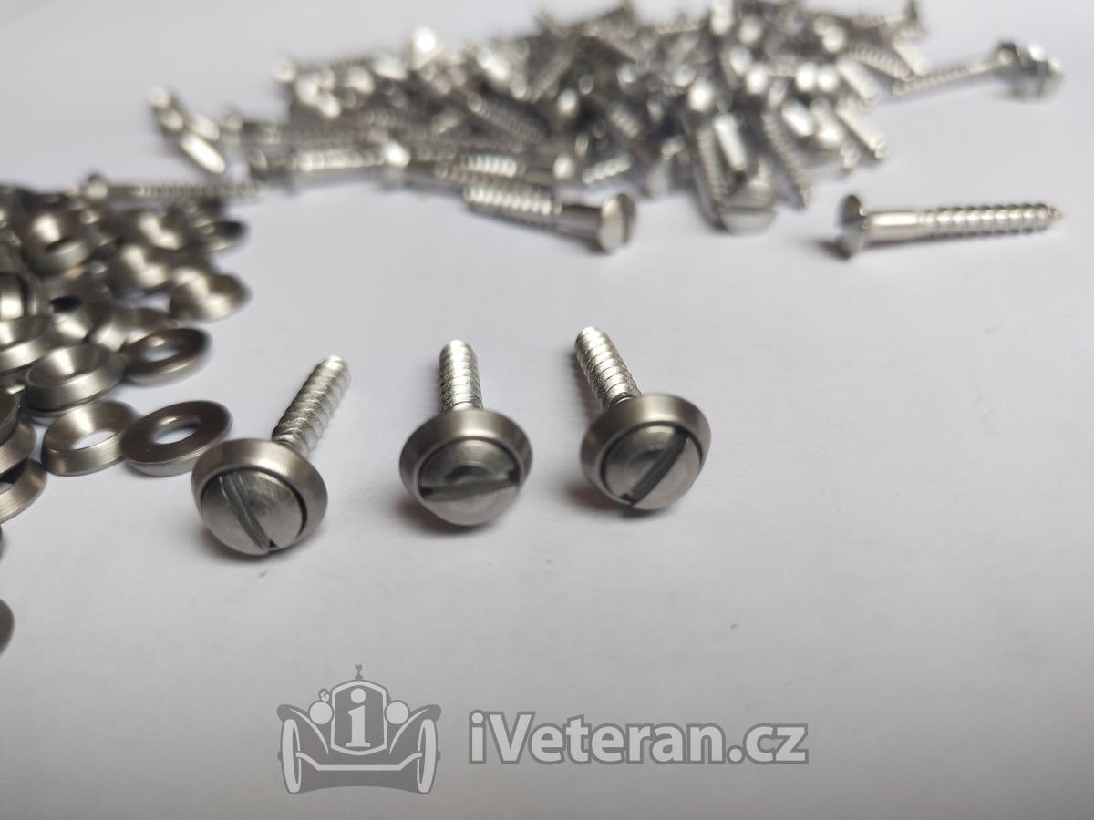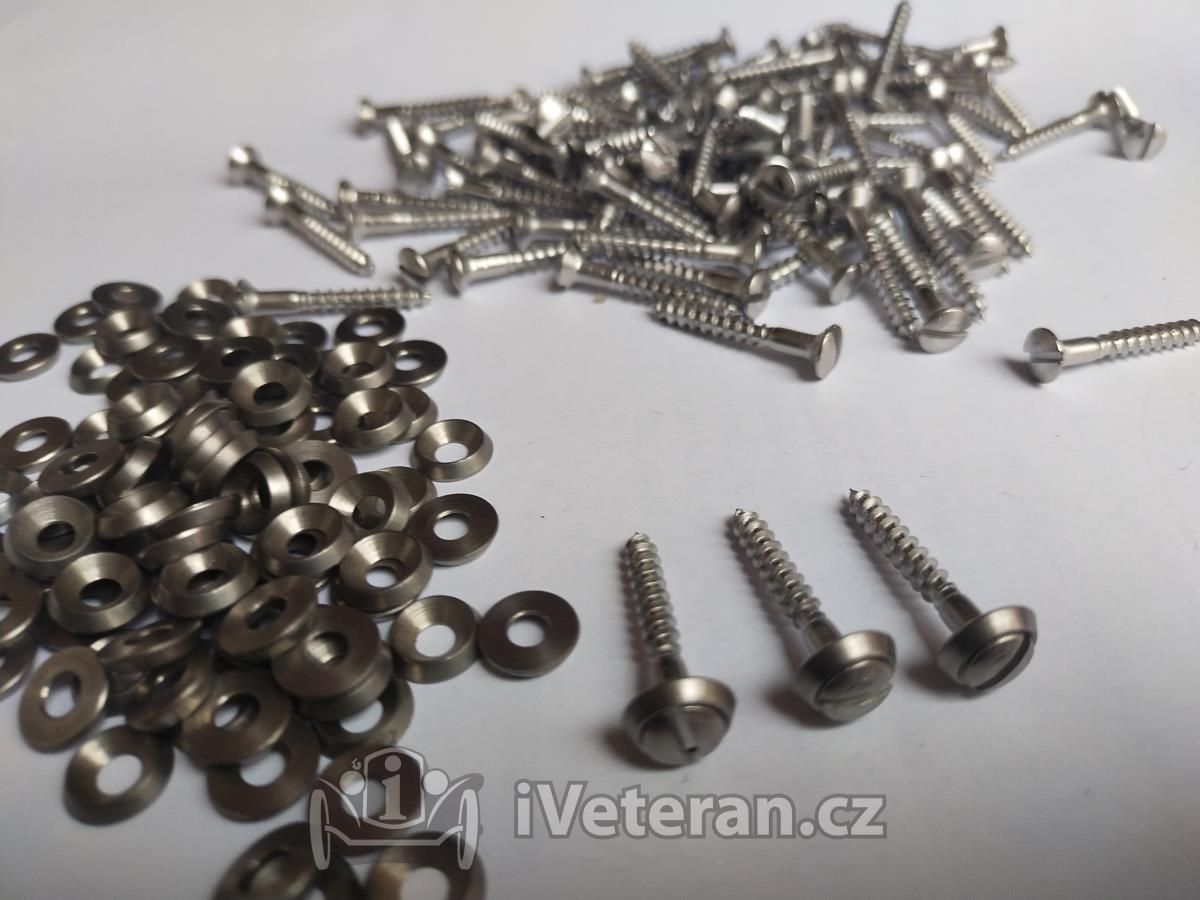 podložky + vruty (oboje z nerezu), které jsou rozměrově i tvarově shodné s originály používanými ve vozech Tatra 57, 12, 30, 52 i jiných typech a pravděpodobně i v jiných veteránech s výdřevou. Šroubky rozměru 3,5 x 25mm, jsou o 5 mm delší, aby to dobře drželo i v původních dírách. Cena za 100 podložek + 100 šroubků je 500,-Kč nebo 200+200 kusů = 900,-Kč