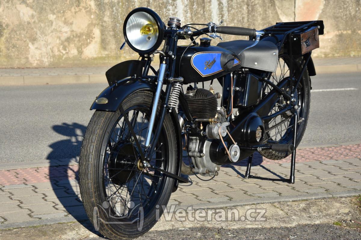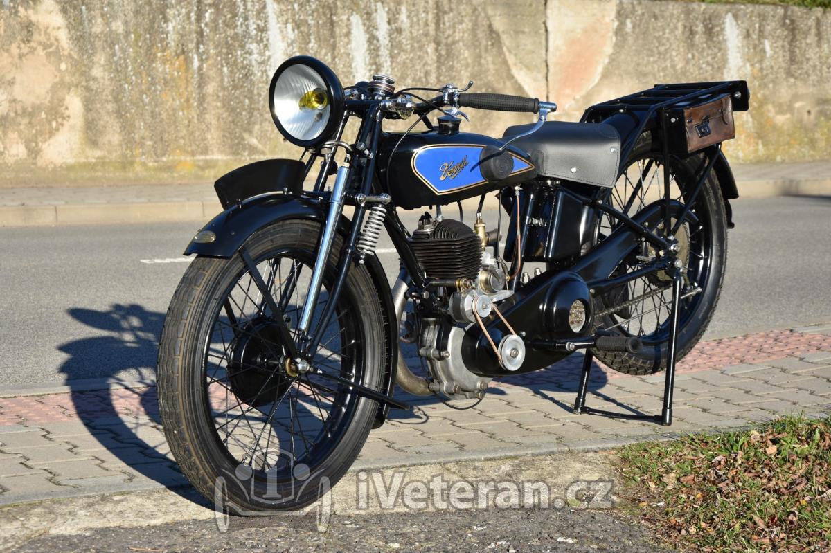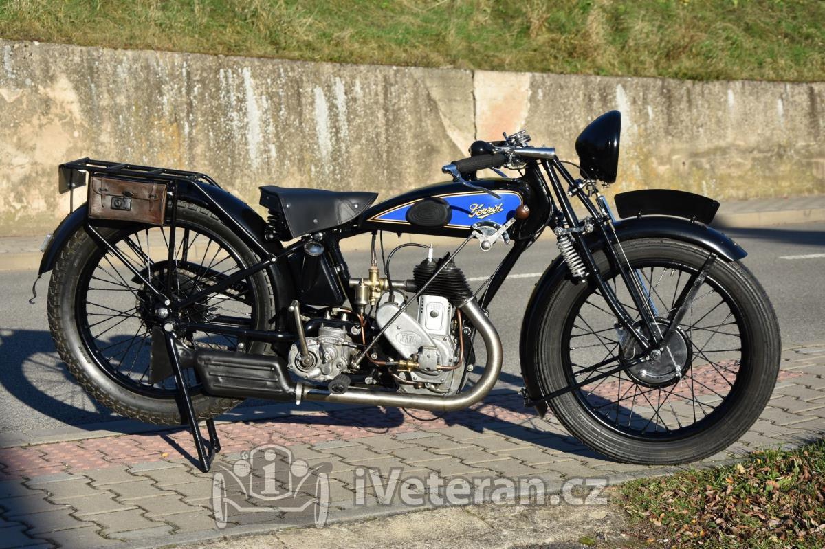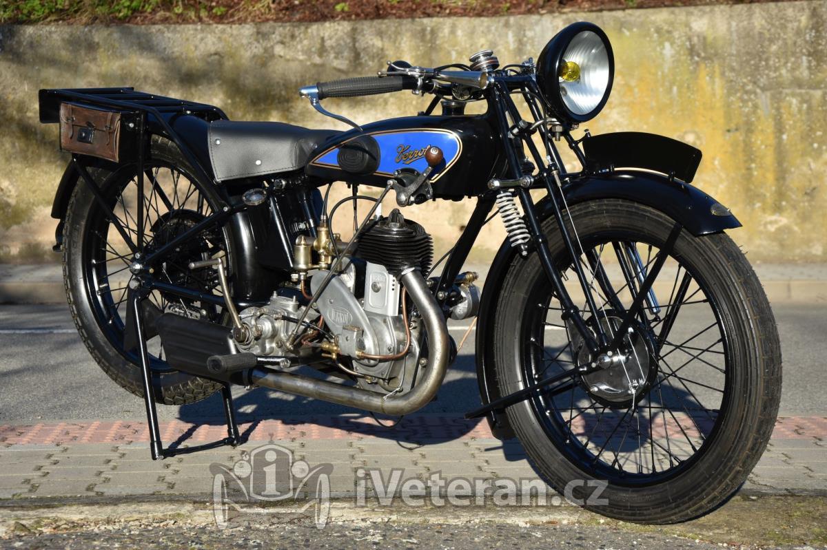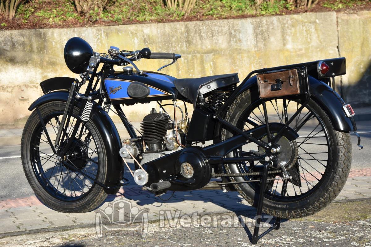 předválečný čtyřtaktní motocykl vyrobený v roce 1929, v pěkném renovovaném funkčním stavu, štítek původního prodejce, ruční řazení, přední vidlice Druid. Cena 129.000,-Kč