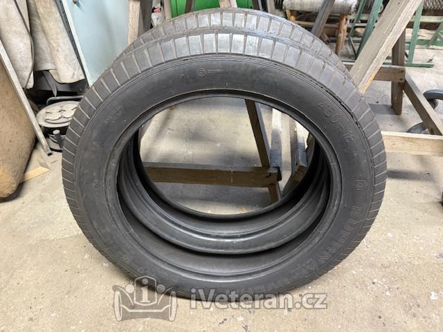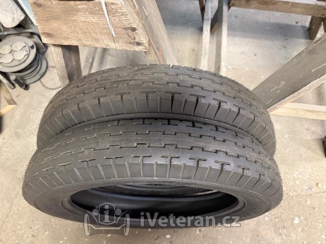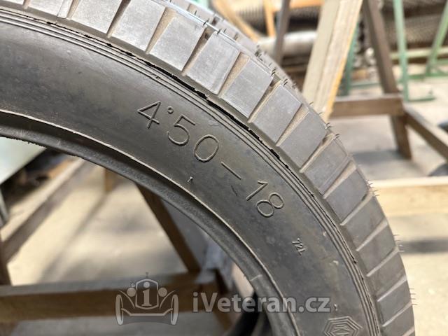2 ks nové, nikdy nejeté pneu Kudrnáč 4,50 x 18" vč. duší. Byly nasazené na ráfku pouze na napasování držáků rezerv při renovaci vozu. Duše mají profi předělaný ventil ze středu na bok.