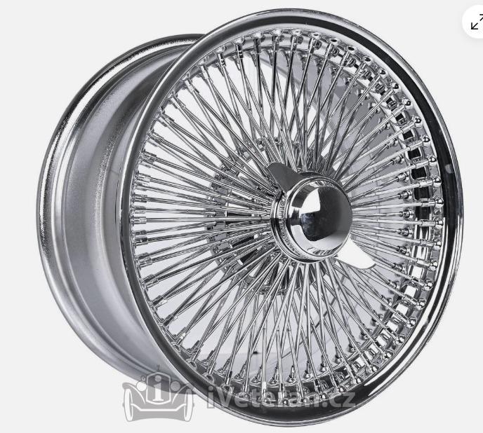 Drátěná chromovaná kola 15x7 ET +25 s výpletem 100 drátů a montáží na adaptér a centrální matici, na všechny možné rozteče šroubů. Vhodné např. na americké vozy, Jaguary XJ a XJS a další. Cena 39 800,- Kč za sadu 4 ks vč. adaptérů a centrálních matic.