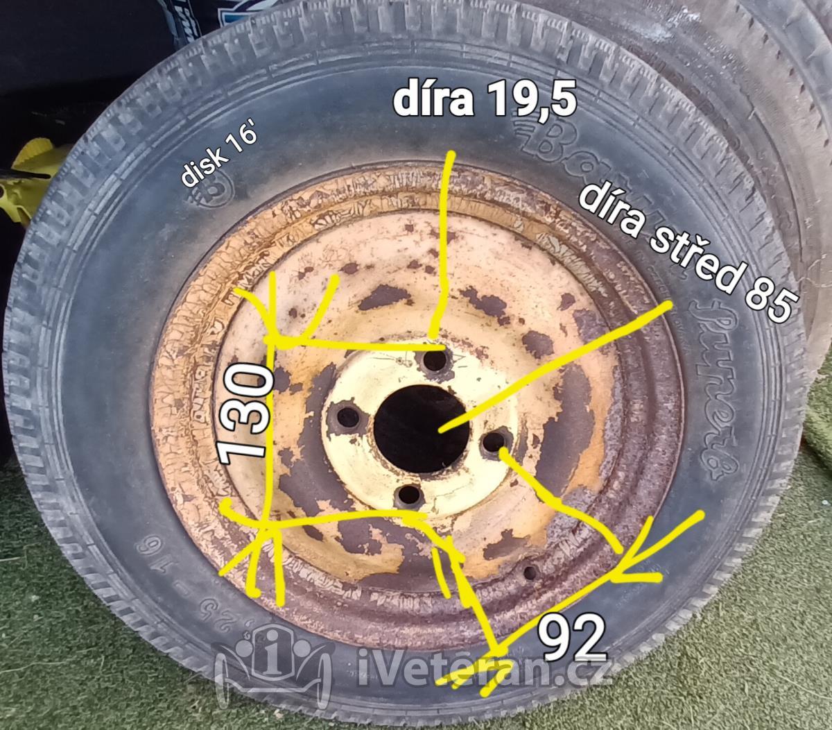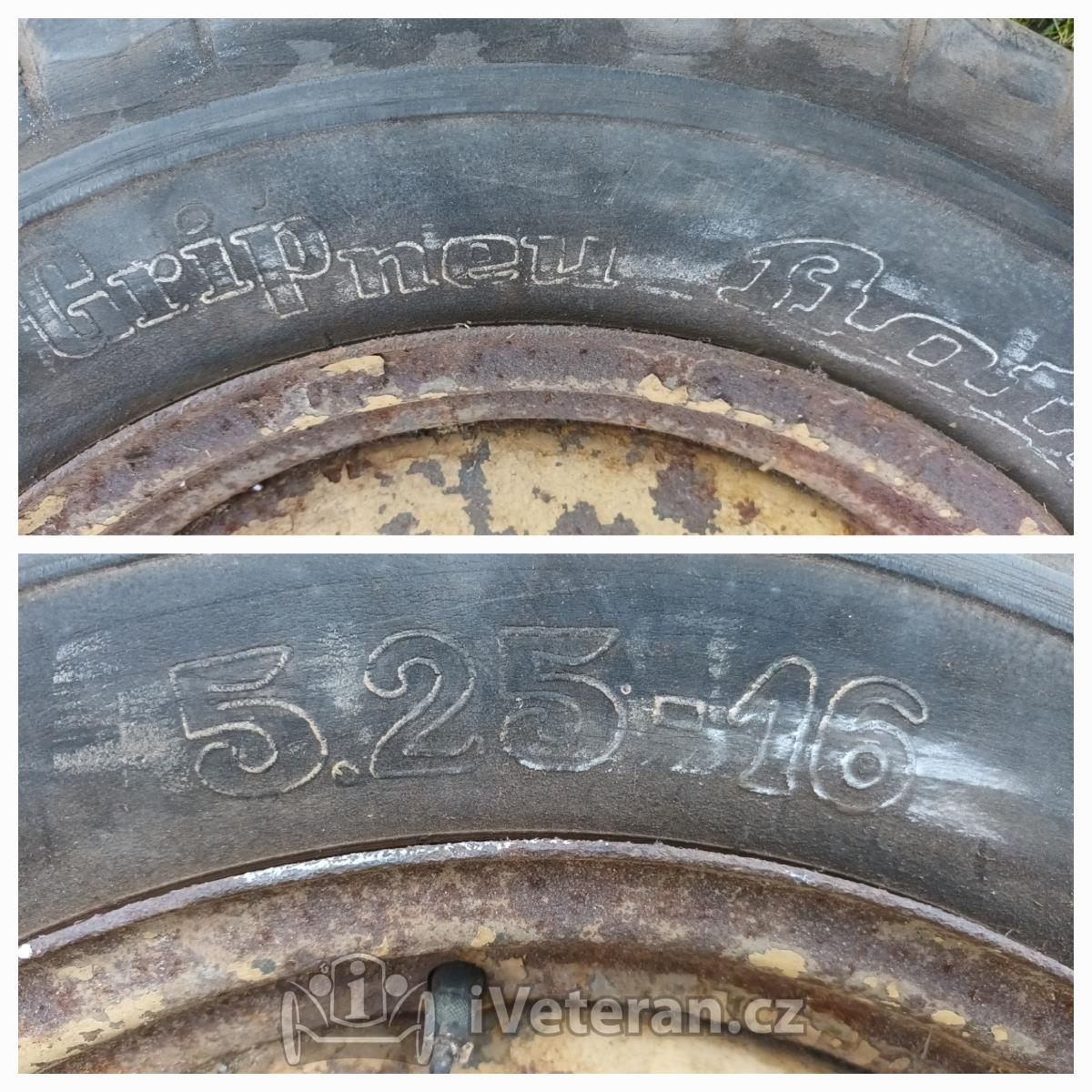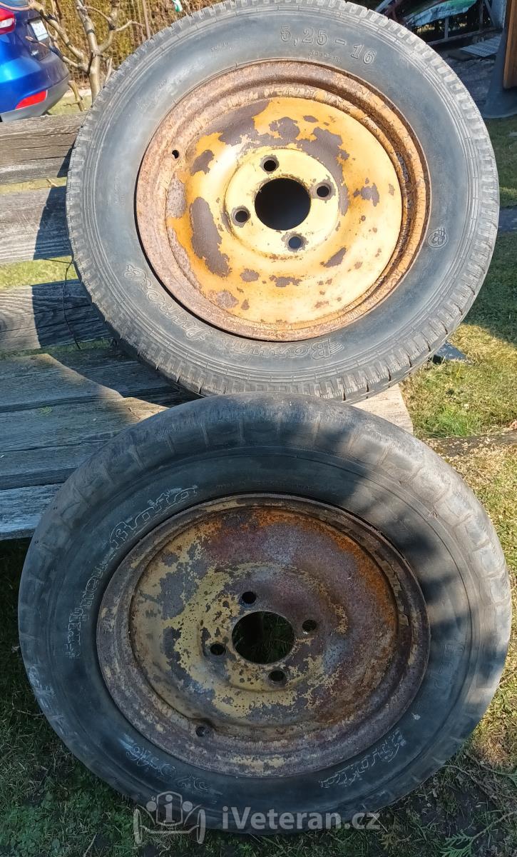 4 ks disků 4 děrových v původním orezlém stavu obuto do ojetých 5,25×16. Neohnuté asi Škoda (DKW, Z ?) Cena 2500. Osobní odběr