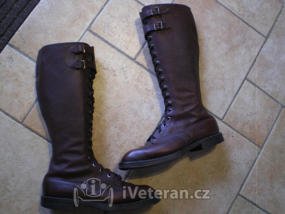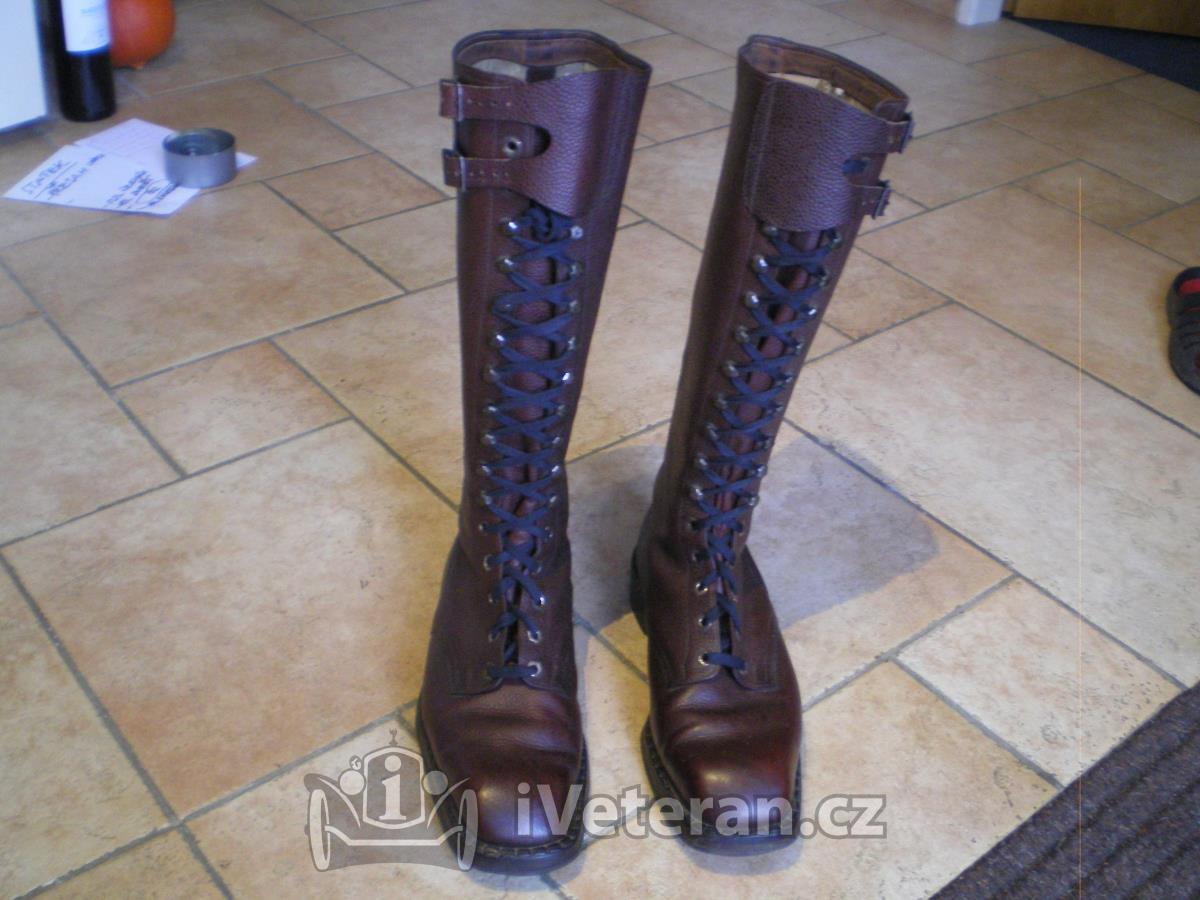 Tyto pěkně zachovalé na předválečné moto vyměním (pouze výměna ! né prodej) za shodný typ menší velikosti. Tyto jsou spíš na štíhlou nohu č. 9, vložka 28cm, délka podrážky 31cm, výška 42cm, vyložené plátnem. Potřebuji č. 7, vložka 26 - 27cm.